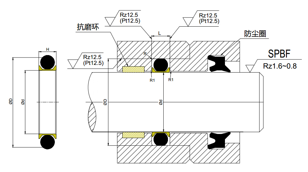 滑動(dòng)材料用填充聚四氟乙烯,此密封件具有很低的摩擦阻力,消除了爬行,確保有很高的耐磨性。因單個(gè)密封件有雙向密封能力,故省去了安裝空間。此密封件可裝在O形圈槽上,比O形圈有較低的滑動(dòng)摩擦以保證有很高的耐用性,還可以用于氣動(dòng)設(shè)備。