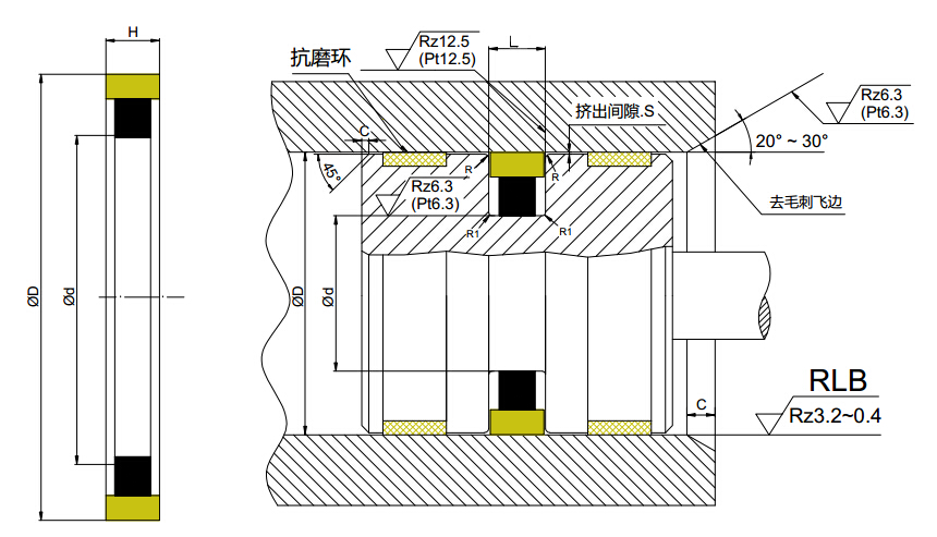 滑動材料用填充聚四氟乙烯,此密封件具有很低的摩擦阻力,消除了爬行,確保有很高的耐磨性。因單個(gè)密封件有雙向密封能力,故省去了安裝空間。