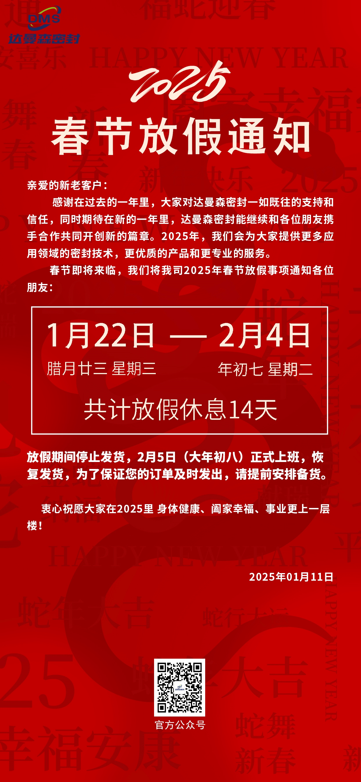 達(dá)曼森密封2025年春節(jié)放假通知